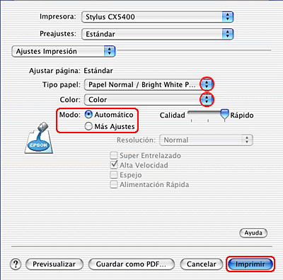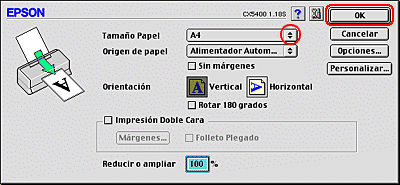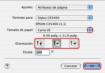 ![]() | Seleccione Stylus CX5400 como el ajuste de Impresora. |