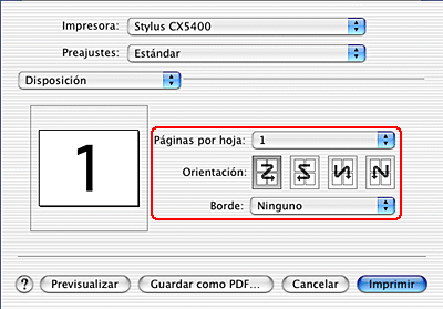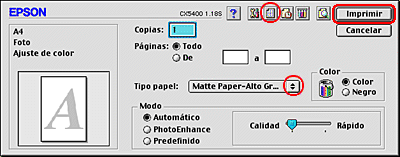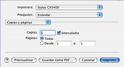 ![]() | Seleccione Stylus CX5400 como el ajuste de Impresora y defina los ajustes de Copias y páginas. |