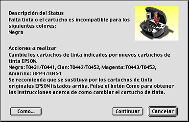 Si queda poca tinta o se agota, aparecerá un botón llamado Cómo. Si hace clic en Cómo, EPSON StatusMonitor le guiará paso a paso en el procedimiento de sustitución del cartucho.