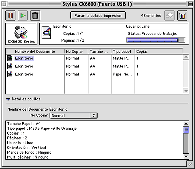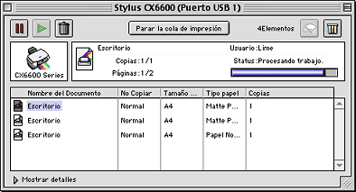 Después de enviar a este producto un trabajo de impresión, puede emplear la utilidad EPSON MonitorIV para comprobar, cancelar o cambiar la prioridad de los trabajos que se encuentran en la cola de impresión. Esta utilidad también muestra el estado del trabajo que se esté imprimiendo en ese momento.