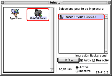 Haga clic en OK. En la lista de puertos del Selector aparecerá el nombre de la impresora compartida.