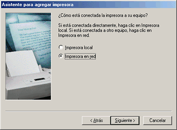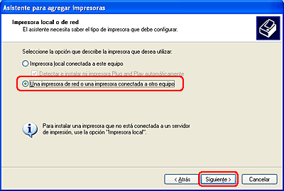 Seleccione Una impresora de red o una impresora conectada a otro equipo, y haga clic en Siguiente.