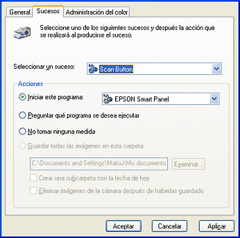 Elija el botón que desee en la lista Sucesos de escáner, luego seleccione la casilla de verificación de la aplicación deseada en la lista Enviar a este programa, y anule la selección del resto de casillas de verificación.