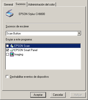En Windows, puede asignar a los botones del panel de control cualquier aplicación que no sea EPSON Smart Panel y que admita sucesos de escáner (por ejemplo, Microsoft Imaging para Windows, siempre y cuando esté instalada). Cuando pulse los botones del panel de control, se abrirá el cuadro de diálogo de EPSON Scan, o comenzará el escaneado y la imagen escaneada se enviará automáticamente a la aplicación (que no es necesario abrir manualmente).
