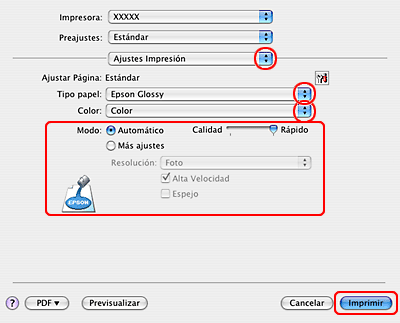 Seleccione los ajustes de Tipo papel, Color y Modo adecuados. Si desea más información sobre Ajustes Impresión, consulte la Ayuda on-line.