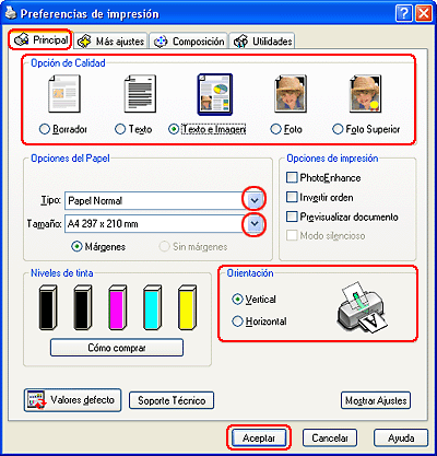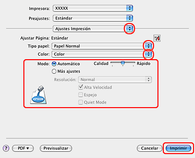 Seleccione los ajustes de Tipo papel, Color y Modo adecuados. Si desea más información sobre Ajustes Impresión, consulte la Ayuda on-line.