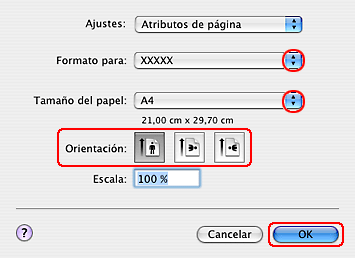 Seleccione los ajustes de Tamaño de papel y Orientación adecuados.