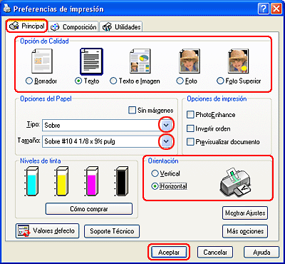 Seleccione el tamaño de sobre adecuado en el ajuste Tamaño de papel. También puede definir un tamaño de sobre personalizado. Si desea más detalles, consulte la ayuda en línea.
