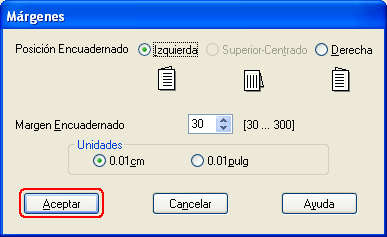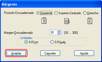 Elija entre cm o pulg. como el ajuste de Unidad. Especifique la anchura del margen de encuadernación.