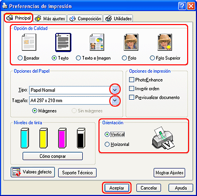 Seleccione los ajustes de Tipo papel, Color y Modo adecuados. Si desea más información sobre Ajustes Impresión, consulte la Ayuda on-line.