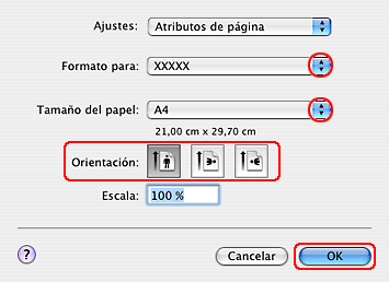 Seleccione los ajustes de Tamaño de papel y Orientación adecuados. También puede definir un tamaño de papel personalizado. Si desea más detalles, consulte la Ayuda on-line.