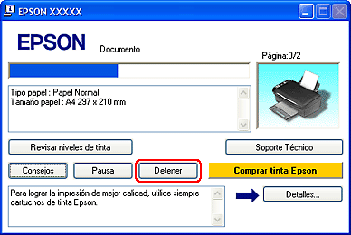 Puede cancelar la impresión tanto a través del contador de avance como de EPSON Spool Manager. Consulte la sección correspondiente más adelante.