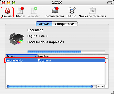 Cuando un trabajo de impresión llega al principio de la cola, EPSON Spool Manager lo envía a la impresora. Puede cancelar trabajos de impresión en el Spool Manager. También puede ver información del estado de trabajos de impresión, así como hacer una pausa, reanudar o reiniciar la impresión.
