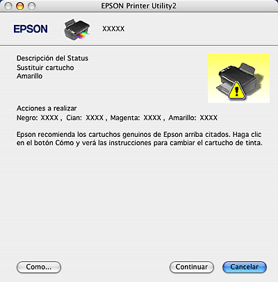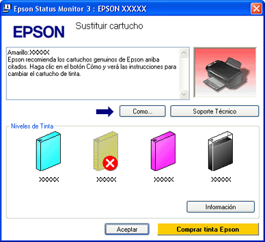 Si queda poca tinta o se agota, aparecerá el botón Cómo. Si hace clic en Cómo, EPSON Status Monitor 3 le ayudará paso a paso en el procedimiento de sustitución del cartucho.
