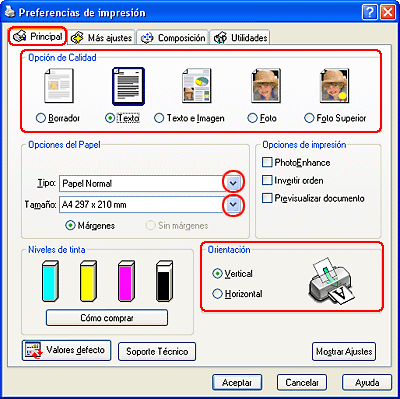 Haga clic en la ficha Principal y seleccione una de las siguientes Opciones de Calidad: