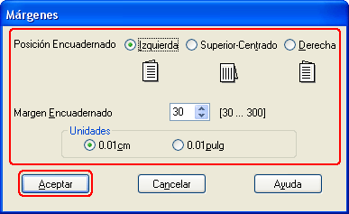 Elija entre cm o pulg. como el ajuste de Unidades. Especifique la anchura del margen de encuadernación.