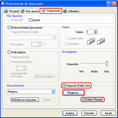 Haga clic en la ficha Composición y seleccione la casilla de verificación Impresión Doble Cara.