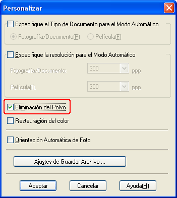 Modo Automático: Haga clic en el botón Personalizar. Haga clic en la casilla de verificación Eliminación del Polvo y luego en Aceptar. Continúe con el paso 9.