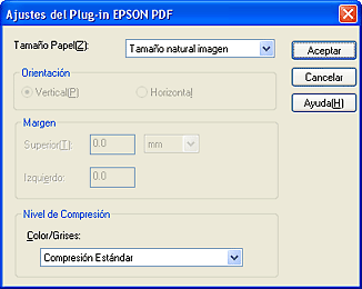 Si desea cambiar algún ajuste actual de PDF, haga clic en el botón Opciones. Aparecerá la ventana Ajustes del Plug-in Epson PDF.
