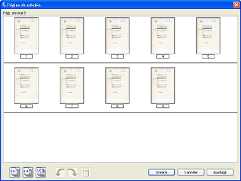 En la ventana Página de edición aparecen miniaturas de cada página escaneada. Puede utilizar las herramientas de la ventana Página de edición para seleccionar, rotar, reorganizar y borrar páginas del documento. Haga clic en el botón Ayuda si desea más información.