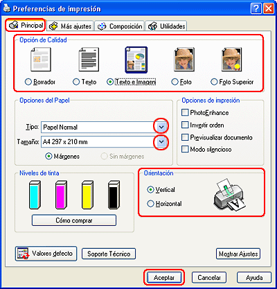 Seleccione los ajustes Tipo papel, Color y Modo adecuados. Si desea más información sobre Ajustes Impresión, consulte la Ayuda on-line.
