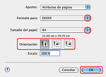 Seleccione los ajustes Tamaño papel y Orientación adecuados. También puede definir un tamaño de papel personalizado. Si desea más detalles, consulte la Ayuda on-line.