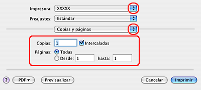 Seleccione la impresora que esté utilizando como el ajuste Impresora. A continuación, configure los ajustes Copias y Páginas.