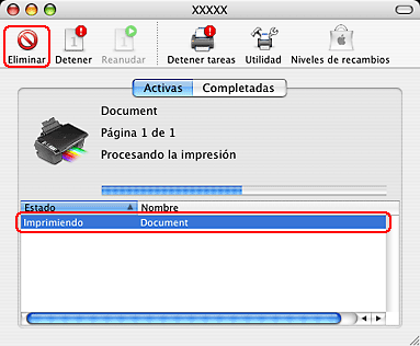 Haga clic en el botón Eliminar para cancelar el trabajo de impresión.