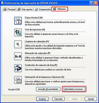 Puede definir ciertos ajustes para aumentar la velocidad de impresión en la ventana Velocidad y Avance. Haga clic en el botón Velocidad y Avance en la ventana Utilidades del controlador de la impresora.