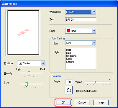 Asegúrese de haber seleccionado la marca correcta en la lista Watermark (Marca de fondo) y seleccione los valores de Color, Position (Posición), Density (Densidad), Size (Tamaño), Font (Fuente), Font Style (Estilo) y Angle (Ángulo). (Si desea más detalles, consulte la Ayuda on-line). Los ajustes se verán reflejados en la ventana de previsualización.