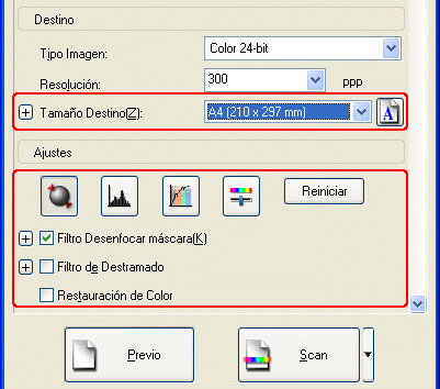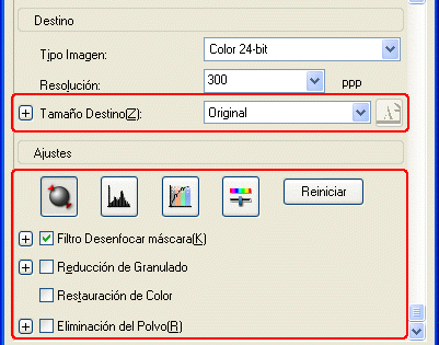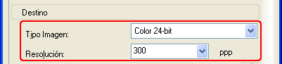 ![]() | Especifique el tipo de archivo de imagen resultante deseado con los ajustes de Destino. |