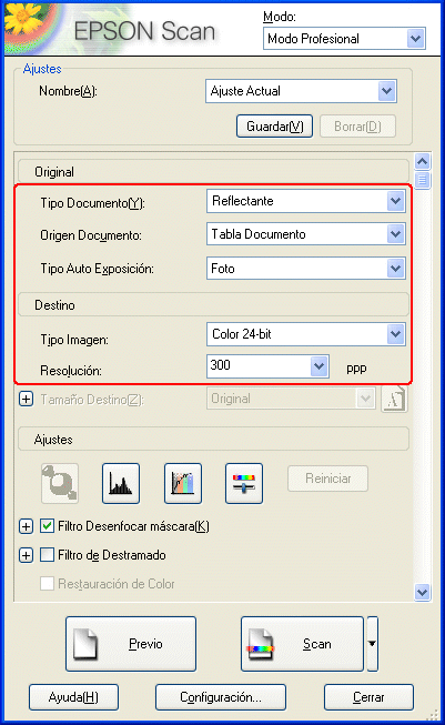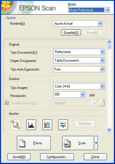 ![]() | Inicie EPSON Scan y seleccione el modo Profesional. Si desea más instrucciones sobre cómo seleccionar un modo de escaneado, consulte Cambio del modo de escaneado. |