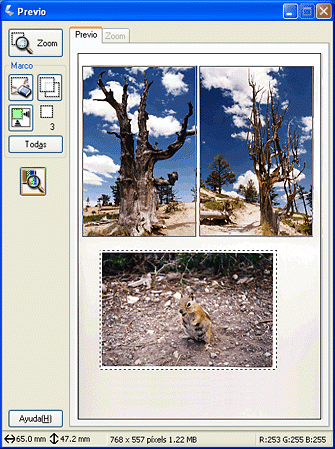 Cuando ya está determinado el tamaño de salida de la imagen escaneada, seleccione un ajuste adecuado en la lista Tamaño destino. En la ventana Previo, aparece un marco proporcional a las medidas del ajuste Tamaño destino. Puede desplazar este marco a la zona de la imagen que desee escanear. Si desea más detalles, consulte la ayuda on-line.