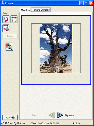 El método de previsualización Normal le permite ver toda la imagen previsualizada y los efectos de los ajustes que configure, así como ajustar todavía más la imagen. También puede utilizar marcos para escanear las partes seleccionadas de una imagen. Para más detalles sobre los marcos, consulte Uso de los marcos.