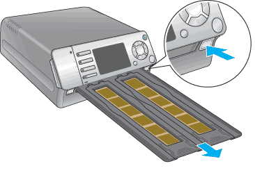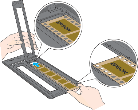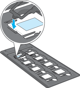 Deslice el borde de la película en el soporte para orígenes de 35 mm, con el lado de base (donde la imagen aparece correctamente) hacia arriba. Colóquela de forma que todos los fotogramas estén colocados dentro del soporte.