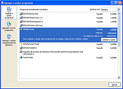 ![]() | Seleccione EPSON Scan en la lista y haga clic en Cambiar o quitar (en Windows XP, 2000 o NT 4.0) o en Agregar o quitar (en Windows Me o 98). |