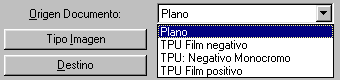 Seleccione uno de ellos según el tipo de película (negativa o positiva, en color o monocroma) que vaya a escanear mientras utiliza el adaptador de transparencias. Si va a escanear película negativa en color, seleccione TPU: Film negativo; para películas negativas monocromas, seleccione TPU: Negativo Monocromo; para películas (o diapositivas) positivas, seleccione el ajuste TPU: Film positivo.