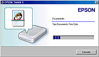 ![]() | Aparecerá la siguiente ventana con una barra de progreso para indicar en avance del escaneado. Puede ver el tipo de documento que se está escaneando. Si está escaneando varias fotografías, también puede ver el número de imágenes escaneadas. |