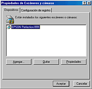 Después de instalar EPSON TWAIN, en el Panel de control aparecerá el icono Escáneres y cámaras, y su escáner figurará en la lista del cuadro de diálogo Propiedades de escáneres y cámaras como se muestra a continuación.