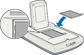 Coloque el adaptador de transparencias opcional en la superficie para documentos de forma que los goznes estén mirando a la parte posterior del escáner y que encaje en la superficie.