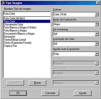 Si desea eliminar un ajuste de Tipo de imagen, seleccione su nombre en la lista Nombre tipo de imagen y haga clic en Borrar.
