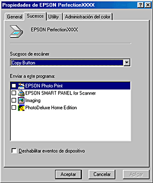 Si necesita desactivar "Sucesos de escáner", seleccione la casilla de verificación Deshabilitar eventos de dispositivo (en Windows 98 y 2000), o seleccione No realizar ninguna acción (en Windows Me) en el cuadro de diálogo Propiedades de EPSON Perfection 1250 o de 1650. Cuando esta casilla de verificación o ajuste esté desactivado, Windows Me, 98 o 2000 puede detectar si el botón