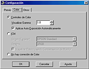 Si está seleccionada ICM o ColorSync, siempre que se utilice la función Auto Exposición, el ajuste Sombra del cuadro de diálogo Controles de imagen se configura automáticamente como 8, y el ajuste de Gamma como 1,0.