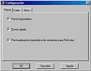 Haga clic en el botón Configuración de la ventana Modo Manual para abrir el cuadro de diálogo Configuración, que le permite configurar diversos ajustes relacionados con la ventana de previsualización y la imagen previsualizada, así como con el ajuste del color.