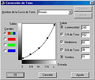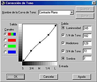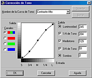 El botón Corrección de Tono aparece atenuado y no está disponible cuando el ajuste Colores está configurado como Blanco y negro y el ajuste Semitono como Ninguno, o cuando la Opción B/N está configurada como Tecnología mejora texto en el cuadro de diálogo Tipo de imagen.