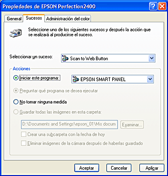 Seleccione un botón en la lista "Sucesos de escáner" y, a continuación, seleccione la casilla de verificación de la aplicación deseada en la lista Enviar a este programa. Quite las marcas del resto de casillas de verificación.