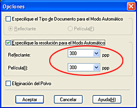 Si desea imprimir imágenes escaneadas en su impresora de inyección EPSON u obtener impresiones en su servicio de revelado de películas preferido, configure la resolución de salida como 300 ppp. Si selecciona una resolución superior a 300 ppp, la impresión tardará más, sin que cambie la calidad de impresión.
