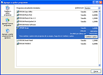 ![]() | Seleccione EPSON Scan en la lista y haga clic en Cambiar o quitar (en Windows XP o 2000) o en Agregar o quitar (en Windows Me o 98). |
