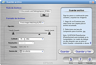 Utilice esta aplicación para escanear, convertir y luego guardar una imagen en una carpeta determinada. Cuando se inicia esta aplicación, la imagen se escanea desde EPSON Scan y se muestra en el cuadro de diálogo Verify Assistant. Haga clic en Siguiente y aparecerá el siguiente cuadro de diálogo.