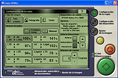 Utilice esta aplicación para transformar su escáner en una fotocopiadora digital. La aplicación parece una fotocopiadora de verdad, aunque sus funciones son mucho más potentes y flexibles que las de las fotocopiadoras convencionales. Cuando inicie esta aplicación, aparecerá la siguiente pantalla.